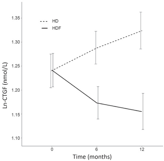 The main outcome was the difference in rate of change in CTGF concentration (percentage per 6 months) between HDF and HD patients during one year of treatment.