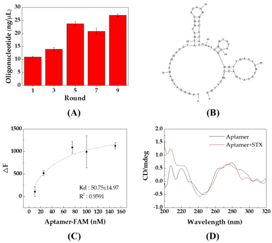 The result of the selection process and characterization of the STX aptamer. (A) DNA recovery from the GO-SELEX rounds. (B) The secondary structure of the STX aptamer. (C) The binding saturation curve of the STX aptamer (n = 4). (D) The CD spectra of the developed aptamer (black) and mixture of STX and the aptamer (red).