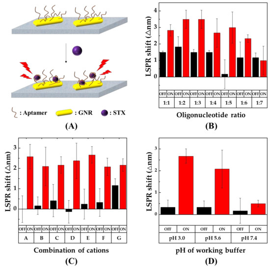 (A) Schematic illustration of the target-aptamer binding performance. Optimization of the experimental conditions. (B) Comparison of effects of STX binding at different oligonucleotide ratios (aptamer: spacer) on LSPR shift. (n = 6). (C) Comparison of LSPR shifts depending on different salts combinations (A: K+/Ca2+, B: K+/Mg2+, C: Na+/Ca2+, D: Na+/K+, E: Na+/K+/Ca2+, F: Na+/K+/Mg2+, G: Na+/Mg2+). (n = 6). (D) Comparison of the effect of pH on LSPR shift; pH 3.0 = 20 mM citrate, pH 5.6 = 20 mM acetate, pH 7.4 = 20 mM Tris-HCl. (n = 6). The cases of absence or presence of STX were marked as OFF or ON, respectively.