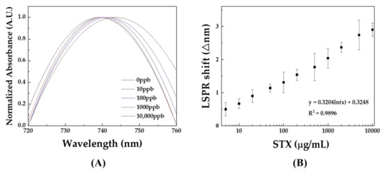 (A) LSPR absorption spectra depending on the concentration of the STX. (B) A plot of LSPR shifts against the STX concentrations (n = 6). Standard STXs dissolved in working buffer solution were utilized in this test.