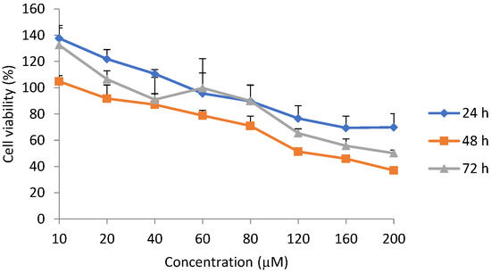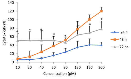 Cytotoxicity at the same dose, but at different exposure durations, revealed a time-dependent effect. After 24 h exposure to epoxyscillirosidine, the lowest percentage cytotoxicity across all the different doses occurred (Figure 3). The 48 h duration showed lower percentage cytotoxicity when compared with 72 h at lower doses up to 60 µM, but the effect was higher from 80–200 µM. Cytotoxicity at 72 h was significantly (p < 0.05) different from that at 24 h.