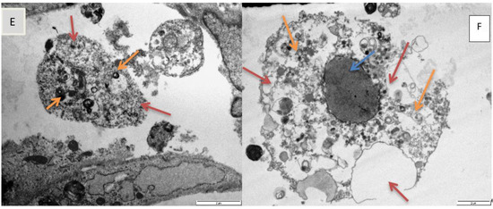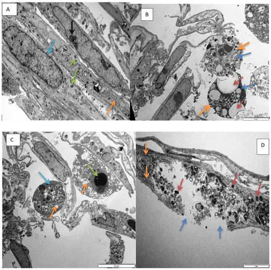 Transmission electron micrograph showing, (A). nucleus (blue arrow), mitochondria (green arrows), and endoplasmic reticulum (ER, orange arrow) in normal H9c2 cells (72 h control). Scale bar 5 µm. (B). Micrograph showing vacuolation (brown arrows), diffuse dissolution of the cytoplasm (blue arrows), spherical shaped cells (thick orange arrows) in H9c2 cells exposed to epoxyscillirosidine (160 µM) after 24 h. Scale bar 10 µm. (C). Micrograph showing karyolysis (green arrow), vacuolation (orange arrows) and diffuse dissolution of the cytoplasm and organelles (blue arrow) in H9c2 cells (200 µM, 24 h). Scale bar 10 µm. (D). Micrograph showing damaged plasma membrane (blue arrows), numerous vesicles containing electron dense material (brown arrow) and ER (orange arrows) in H9c2 cells (120 µM, 48 h). Scale bar 2µm. (E). Micrograph showing diffuse dissolution of the cytoplasm (blue arrow) and vesicles containing electron dense material (orange arrows) in amoeboid mis-shaped H9c2 cells (40 µM, 72 h). Scale bar 2 µm. (F). Micrograph showing karyolysis (blue arrow), vacuolation (brown arrows) and diffuse dissolution of the cytoplasm (orange arrows) in H9c2 cells (200 µM, after 72 h). Scale bar 2 µm.