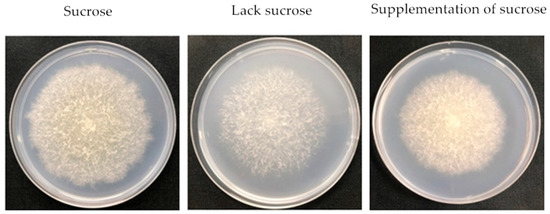 The F. proliferatum strain was cultivated in different culture media while mycelial growth rate, sporulation and FB1 production were checked after 3 and 6 days. Colony morphology varied when F. proliferatum was cultured in different media (Figure 1). In short, the F. proliferatum showed a better mycelial growth rate and more sporulation in the medium in the presence of sucrose than the medium in the absence of sucrose. Furthermore, an additional sucrose supplementation recovered the growth of F. proliferatum, which was almost the same as the medium in the presence of sucrose (Figure 2A,B). For FB1 content, the study indicated that F. proliferatum can produce FB1 in the medium with or without sucrose, but FB1 content in the medium without sucrose was significantly (p < 0.05) higher than the culture medium with sucrose, while an additional supplementation of sucrose after 3 days of culture in the medium without sucrose significantly (p < 0.05) inhibited the FB1 production (Figure 2C) according to the Duncan’s multiple comparison in ANOVA analysis. Thus, supplementation of sucrose recovered the growth but also inhibited the FB1 production by F. proliferatum, suggesting that the sucrose starvation increased FB1 production.