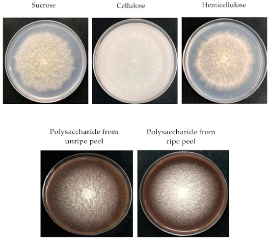 Banana, as one of the most economically important fruit crops worldwide, deteriorates easily due to rot development caused by postharvest pathogens, including F. proliferatum [25]. Banana fruit as a hosts for these types of pathogens can provide nutrition for F. proliferatum infection, especially the banana peel is rich in sugar ingredients like cellulose, hemicellulose and pectin as carbon sources when the fruit becomes edible. F. proliferatum might face these polysaccharides while infecting banana fruit. Additionally, banana peel is the first natural infection place for F. proliferatum, and, thus, F. proliferatum mainly grows on the banana peel after infection. Hence, investigation of the effect of the polysaccharides from banana peel on the fumonisin production from F. proliferatum might enable better understanding of the interaction between banana fruit and F. proliferatum.