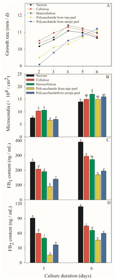 After the F. proliferatum strain was cultivated in the culture media containing five different carbon sources, mycelial growth rate, sporulation and FB content were investigated after 3 and 6 days. A different colony morphology of F. proliferatum was observed when five carbon sources were used (Figure 3) while the growth rate was almost the same as that on the 6th day (Figure 4A), but the sporulation of F. proliferatum was induced in the media containing cellulose, hemicellulose, and polysaccharide extracted from banana peel (Figure 4B). Furthermore, the contents of FB1 and FB2 produced by F. proliferatum in the culture media with cellulose, hemicellulose and polysaccharide extracted from banana peel were significantly (p < 0.05) lower than that in the culture medium with sucrose according to the Duncan’s multiple comparison in ANOVA analysis (Figure 4C,D).