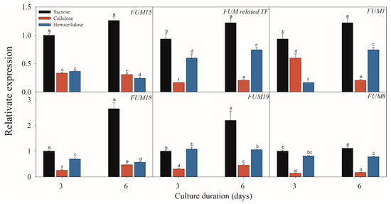 Effect of sucrose, cellulose and hemicellulose on the expressions of the fumonisin-related genes of F. proliferatum. The detailed information of these genes is shown in Table 1. The data are presented as means of three independent replicates. The vertical bars indicate standard errors of three replicates. Different letters represent significant differences (p < 0.05).