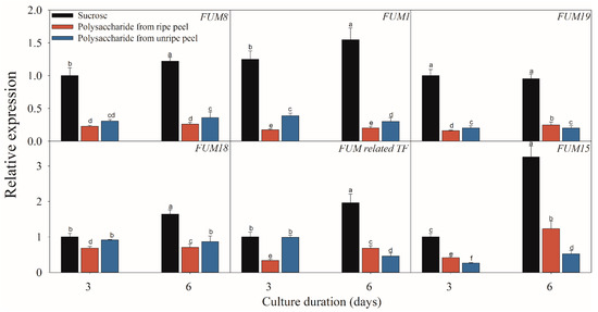 Effect of sucrose and polysaccharide extracted from unripe or ripe banana peel on the expressions of the fumonisin-related genes of F. proliferatum. The detailed information of these genes is shown in Table 1. The data are presented as means of three independent replicates. The vertical bars indicate standard errors of three replicates. Different letters represent significant differences (p < 0.05).