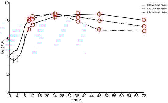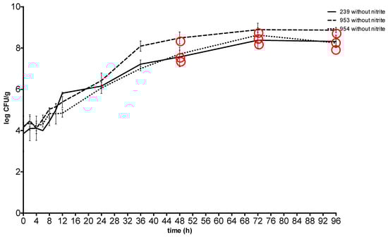 Growth and enterotoxin production of S. aureus at 37 °C in meat without sodium nitrite. Red circle: enterotoxin production. 239: S. aureus ATCC 29213; 953: S. aureus field strain; 954: S. aureus field strain.