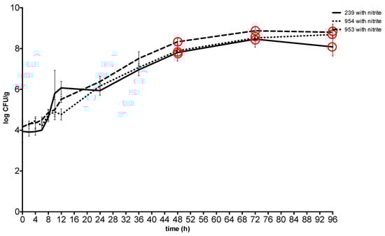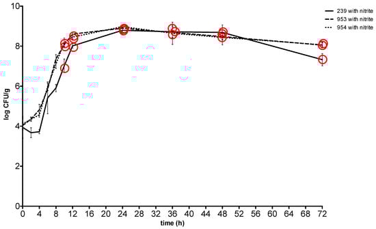 Growth and enterotoxin production of S. aureus at 37 °C in meat with sodium nitrite. Red Circle: enterotoxin production. 239: S. aureus ATCC 29213; 953: S. aureus field strain; 954: S. aureus field strain.