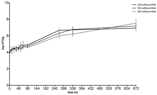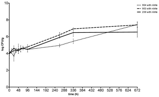 The initial concentration of S. aureus spiked ranged between 3.94 ± 0.16 CFU g−1 and 4.19 ± 0.11 CFU g−1 in meat with sodium nitrite and between 3.85 ± 0.27 CFU g−1 and 4.26 ± 0.17 CFU g−1 in meat without sodium nitrite.