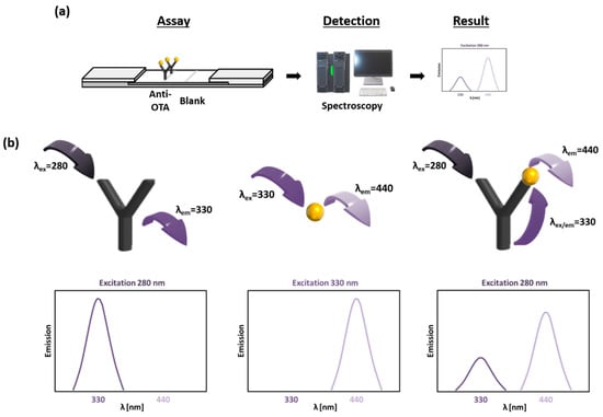 The developed FRET-LFI in this study was designed based on the FRET between OTA and the anti-OTA antibody. Anti-OTA antibodies were immobilized on a nitrocellulose membrane, and the sample solution containing the target antigen was allowed to flow from the bottom of the sensor, as shown in Figure 1a. The sample solution flowed over the anti-OTA antibody immobilized membrane due to the capillary force of the membrane, and the target material in the sample solution reacted with the antibody immobilized on the membrane. After the immune reaction, the fluorescence spectrum could be identified by irradiating the membrane at 280 nm to determine antigen-antibody binding. As shown in Figure 1b, when the antibody was alone on the membrane, an intrinsic fluorescence emission band at 330 nm could be detected upon excitation at 280 nm. The antigen alone resulted in an intrinsic fluorescence emission band at 440 nm upon excitation at 330 nm. However, the antibody and the antigen together would produce emission bands at both 330 nm and 440 nm upon excitation at 280 nm because of the FRET between the antibody and the antigen. Applying this system to a membrane allows matrix effects to be minimized, and fluorescence signals could be identified even in dark substances, such as coffee, enabling the rapid and easy analysis of OTA.