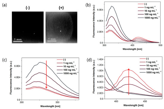 Fluorescence images and emission spectra of anti-OTA antibody (0.44 mg∙mL−1) upon exposure to different concentrations of OTA in 25 mM 4-morpholineethanesulfonic acid hydrate (MES) buffer (pH 6.0) with 0.3% tween 20 (λex = 280 nm). (a) Fluorescence images in a nitrocellulose membrane without OTA (left) and with OTA (right) with a bandpass filter (450/40) (λex = 254 nm), and fluorescence spectra in different wavelengths (b) from 300 to 500 nm; (c) from 300 to 380 nm; and (d) from 370 to 480 nm.