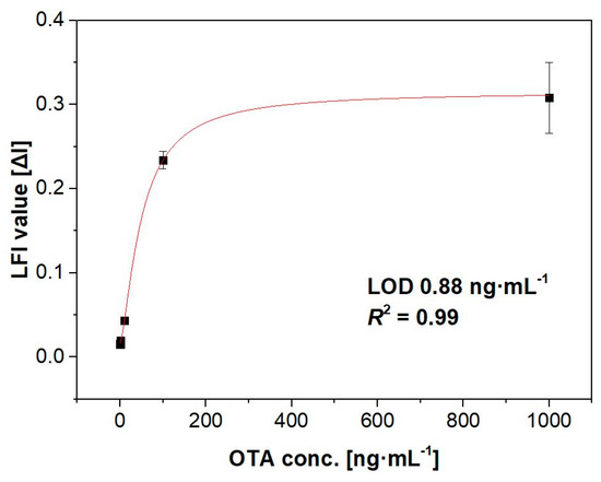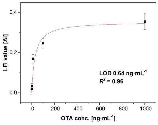 Recently, a membrane-based test strip, also referred to as the lateral flow immunoassay (LFI), has become popular for diagnostic tests [20,21,22]. The reason for its popularity is that the device provides a rapid, simple, low-cost, and easy to operate detection method. This device does not require any further reagents to obtain results after applying the sample solution, and users can read the results quickly and easily without the need for specialized instruments or expertise. Several studies have attempted the analysis of OTA using a membrane-based immunosensor [23,24,25,26,27,28]. However, most current methods for OTA analysis require additional labeling steps, which are complicated and time-consuming.