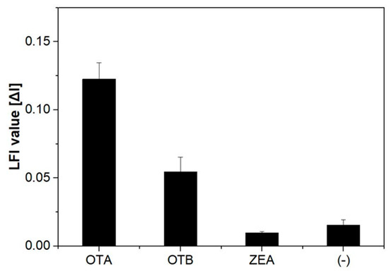 Specificity of the system to the mycotoxins OTA, ochratoxin B (OTB), and zearalenone (ZEA) at a standard concentration (10 ng∙mL−1). The error bars indicate the standard deviation from three independent experiments.