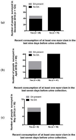 Bar graphs showing the number of people that consumed clams during the seven to nine days prior to urine sampling (Yes category) and the number of domoic acid (DA)-positive urine samples (gray portion in bar) collected in (a) December 2015, (b) April 2016, and (c) May 2016.