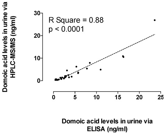 Comparison of domoic acid (DA) concentrations in urine samples (n = 30) quantified via Biosense DA enzyme-linked immunosorbent assays (ELISA) and high performance liquid chromatography tandem mass spectrometry (HPLC-MS/MS).