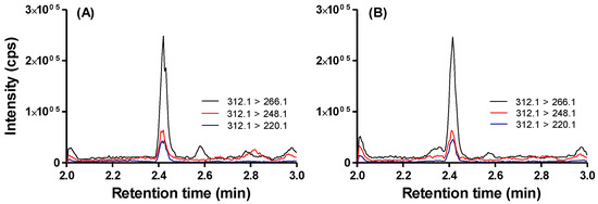 High performance liquid chromatography tandem mass spectrometry (HPLC-MS/MS) chromatograms of three domoic acid (DA) transitions (m/z 312.1 > 266.1, 248.1, 220.1) in (A) spiked urine with 19.9 ng DA/mL, and (B) human urine sample measured with 20.2 ng DA/mL.