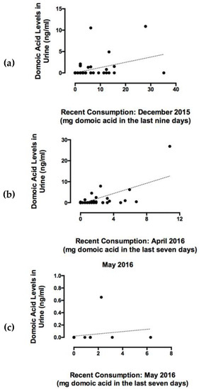 Comparison of total domoic acid exposure in the previous nine days in people surveyed in (a) December 2015, or previous seven days in people surveyed in (b) April and (c) May 2016, and toxin levels quantified via HPLC-MS/MS in corresponding urine samples collected on the same day that participants completed the recent consumption surveys.