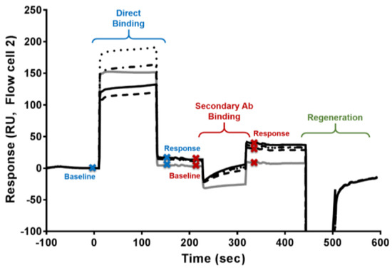 Overlay plot of sensorgrams showing the analysis cycle: direct binding, secondary antibody binding, and regeneration. Respective baselines and responses (blue = direct binding and red = secondary antibody binding) used to calculate the SPR signal are marked with “X” on the curves. The black lines (dotted, dash-dot, solid, and dashed) are representative sensorgrams from the four serum samples collected from a “high” RC consumer (ID 1 in Table 1 and Figure 1): November 2012 sample (dotted curve); December 2015 sample (dashed curve), April 2016 sample (solid curve), and May 2016 sample (dashed-dotted curve). The grey curve illustrates a representative sensorgram for a control serum sample (CS; human serum from a seafood consumer from a region without DA blooms; same sample as displayed in Figure 1). A simple visual evaluation illustrates that the “high” RC consumer, at all timespoints, had more SPR signal at both the direct binding response (blue Xs) and the secondary antibody binding response (red Xs) steps than the CS sample. These values are quantified and graphed in Figure 1.