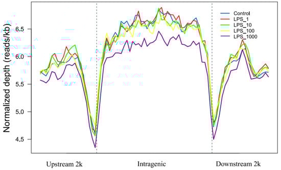 Distribution of MeDIP-seq reads in the intragenic region and the regions 2 kb upstream and downstream in MAC-T bovine mammary epithelial cells under different treatments of lipopolysaccharide (LPS). The x-axis indicates the position of reads in different genomic regions, and the y-axis indicates the normalized read number. The treatments were as follows: Control, without LPS; LPS_1, 1 EU/mL; LPS_10, 10 EU/mL; LPS_100, 100 EU/mL; and LPS_1000, 1000 EU/mL.