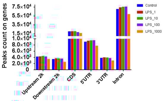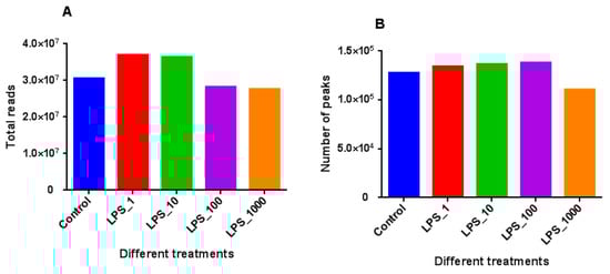 The number of reads was higher in treatments with 1 or 10 EU/mL LPS, as compared with control (Figure 2). The number of reads was lower when the dose of LPS increased to 100 or 1000 EU/mL. The global DNA methylated peaks were higher in treatments with 1, 10 or 100 EU/mL LPS, but lower in the treatment of 1000 EU/mL LPS.