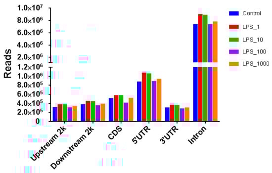 The number of reads in different genomic components with the treatment of 1 or 10 EU/mL LPS was higher than that of the control, whereas the treatments with 100 or 1000 EU/mL LPS did not increase the number of reads compared with control (Figure 3). The number of methylated genes in all the components except the CDSs increased with almost all LPS treatments except the 1000 EU/mL LPS treatment (Figure 4).