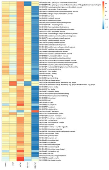The numbers of methylated genes in the upstream 2k region in gene ontology (GO) function analysis under different lipopolysaccharide (LPS) treatments. Each column represents a treatment and each row represents a GO pathway. The number of methylated genes in the pathway is expressed in red-blue color gradients from high to low. The treatments were as follows: Control, without LPS; LPS_1, 1 EU/mL; LPS_10, 10 EU/mL; LPS_100, 100 EU/mL; and LPS_1000, 1000 EU/mL.