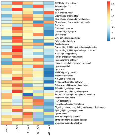 CpG islands are mainly densely distributed in the promoter which is principally located in the 2 kb upstream region. We analyzed gene ontology (GO) function and Kyoto Encyclopedia of Genes and Genomes (KEGG) pathway enrichment of peak related genes in the upstream 2k region of the TSS. The pathways of adjusted p < 0.05 were shown in heat maps. In the GO functional enrichment pathways, the number of methylated genes obviously increased when cells were treated with 10 EU/mL LPS, whereas the number of methylated genes was lowest when treated at 1000 EU/mL of LPS (Figure 5; Table S1). In the KEGG pathways, the number of methylated genes was the highest when cells were treated with 1 EU/mL LPS, whereas that of methylated genes was the lowest with the 1000 EU/mL LPS treatment (Figure 6; Table S2).