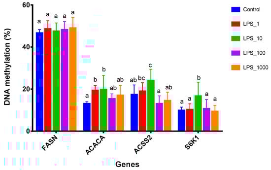 Effects of different LPS treatments on methylation of CpG islands in the promoter region of lactation-related genes in MAC-T bovine mammary epithelial cells. The treatments were as follows: Control, without LPS; LPS_1, 1 EU/mL; LPS_10, 10 EU/mL; LPS_100, 100 EU/mL; and LPS_1000, 1000 EU/mL. Data represent the mean and standard deviation (n = 6/treatment). Columns with different lowercase letters (a,b,c) indicate significantly different values among treatments (p < 0.05). FASN: fatty acid synthase; ACACA: acetyl-CoA carboxylase 1; ACSS2: acyl-CoA synthetase short-chain family member 2; S6K1: ribosomal protein S6 kinase 1.
