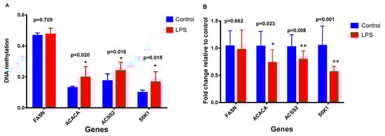 DNA methylation (A) and mRNA expression (B) of lactation-related genes in MAC-T bovine mammary epithelial cells. The cells were treated either without lipopolysaccharide (LPS) or with LPS at 10 EU/mL. Data represent the mean and standard deviation (n = 4/treatment) and the asterisk indicates statistical difference between the indicated column and the control column (*, p < 0.05; **, p < 0.01). FASN: fatty acid synthase; ACACA: acetyl-CoA carboxylase 1; ACSS2: acyl-CoA synthetase short-chain family member 2; S6K1: ribosomal protein S6 kinase 1.