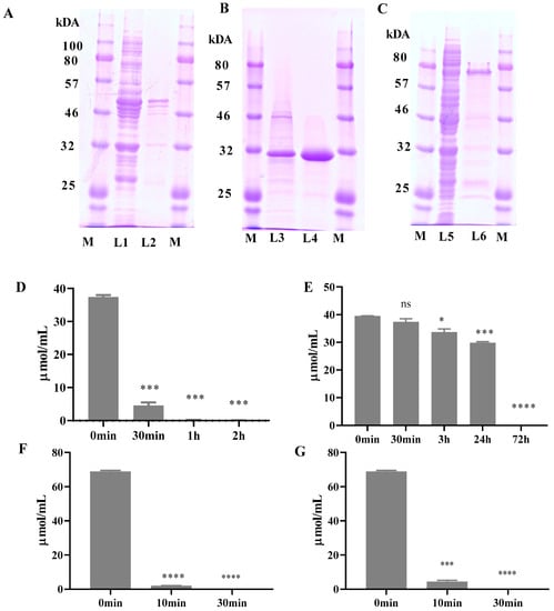Enzyme expression, purification and degradation efficiency. (A) SDS-PAGE gel staining of fusion enzyme. Where, M: protein marker, L1: Carboxypeptidase crude protein, L2: Carboxypeptidase Ni-NTA purified protein (48.66 kDa), (B) L3: zearalenone hydrolase 101 (ZHD101) crude protein, L4: ZHD101 Ni-NTA purified protein (28.7 kDa), (C) L5: Fusion enzyme (ZHDCP) crude protein, L6: Fusion enzyme Ni-NTA purified protein (77.36 kDa). (D) ZEA (50 µM) degradation by ZHDCP enzyme, (E) ZEA (50 µM) degradation by carboxypeptidase enzyme, (F) OTA (50 µM) degradation by ZHDCP enzyme, (G) OTA (50 µM) degradation by carboxypeptidase enzyme. The error bars represent the standard deviation. *, ***, **** indicates a significant difference between control (0 min) and ZEA/OTA degradation by ZHDCP or Carboxypeptidase enzyme in different time at p < 0.05, p < 0.001, and p < 0.0001. ns: not significant.