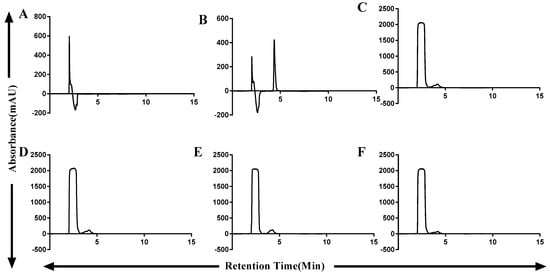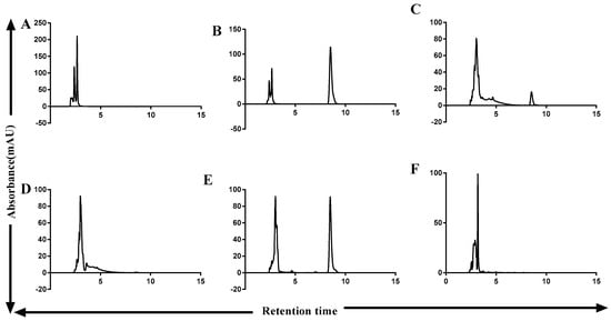 Detection of OTA degrading efficiency of ZHDCP and Carboxypeptidase enzyme by UV-HPLC. (A) Blank (Buffer), (B) Standard 50-µM OTA, (C) 50-µM OTA treated with ZHDCP enzyme in 30 min, (D) 50-µM OTA treated with ZHDCP enzyme in 24 h, (E) 50-µM OTA treated with carboxypeptidase enzyme in 30 min, (F) 50-µM OTA treated with carboxypeptidase enzyme in 24 h.