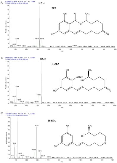 ZEA and ZEA degradation final products by ZHDCP and carboxypeptidase enzyme. (A) Electrospray ionization (ESI)(+)-MS spectra of ZEA: m/z 317.14. (B) ESI(+)-MS spectra of ZEA degradation product H-ZEA: m/z 335.15. By ZHDCP degradation, (C) ESI(+)-MS spectra of ZEA degradation product D-ZEA: m/z 291.16.