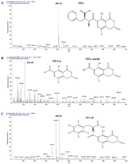 OTA and OTA degradation final products by ZHDCP and Carboxy enzyme. (A) Electrospray ionization (+)-MS spectra of OTA: m/z 404.34, (B) Electrospray ionization (+)-MS spectra of ochratoxin α amide: m/z 256.40. OTA degradation by ZHDCP enzyme, and electrospray ionization (+)-MS spectra of ochratoxin α: m/z 239.60 by Carboxy enzyme degradation, (C) Electrospray ionization (+)-MS spectra of ochratoxin A-d5: m/z 408.53.