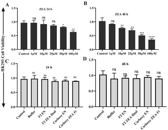 ZEA cell cytotoxicity test on HK293 and its final products. (A) Effect of ZEA on HK293 cell at 24 h, (B) Effect of ZEA on HK293 cells on 48 h, (C) Effect of ZEA final products on HK293 cell in 24 h, (D) Effect of ZEA final products on HK293 cells in 48 h. The values are mean ± SD of three independent experiments.*, **, ***, **** indicates a significant difference between ZEA and control at p < 0.05, p < 0.01, p < 0.001, and p < 0.0001. ns: not significant.