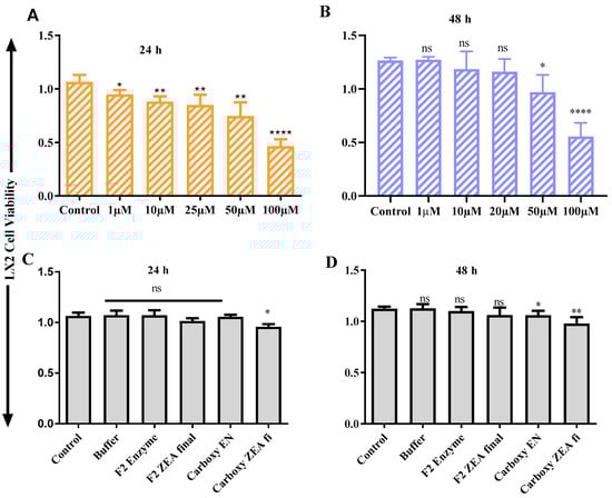 In vitro cell toxicity test ZEA on liver cells (LX2). (A) ZEA effects on LX2 cells in 24 h, (B) ZEA vs. LX2 cells in 48 h, (C) LX2 vs. ZEA final products in 24 h, (D) LX2 vs. ZEA final product in 48 h. Each set of data shows the mean ± SD of the three independent experiments. *, **, ***, **** indicates a significant difference between ZEA and control at p < 0.05, p < 0.01, p < 0.001, and p < 0.0001. ns: not significant.