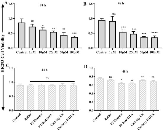 OTA cell cytotoxicity test on HK293 and its final products. (A) Effect of OTA on HK293 cells at 24 h, (B) Effect of OTA on HK293 cells on 48 h, (C) Effect of OTA final product on HK293 cells in 24 h, (D) Effect of OTA final product on HK293 cells in 48 h. Each set of data shows the mean ± SD of the three independent experiments. *, **, ***, **** indicates a significant difference between OTA and control at p < 0.05, p < 0.01, p < 0.001, and p < 0.0001. ns: not significant.