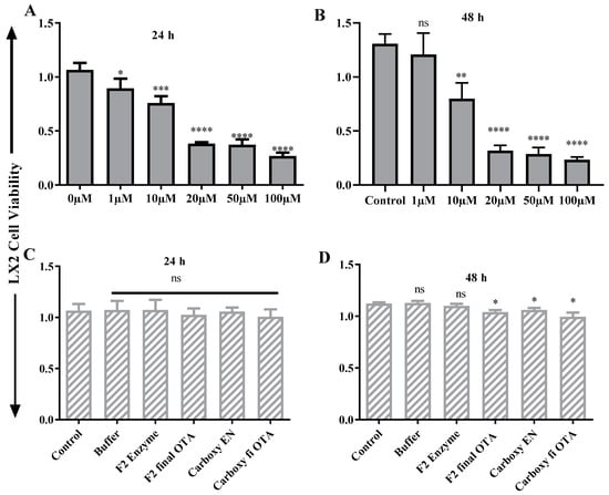 In vitro cell toxicity test OTA on liver cells (LX2). (A) OTA effects on LX2 cells at 24 h, (B) OTA vs. LX2 cells at 48 h, (C) LX2 vs. OTA final product in 24 h, (D) LX2 vs. OTA in 48 h. Each set of data shows the mean ± SD of the three independent experiments. *, **, ***, **** indicates a significant difference between OTA and control at p < 0.05, p < 0.01, p < 0.001, and p < 0.0001. ns: not significant.
