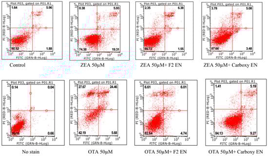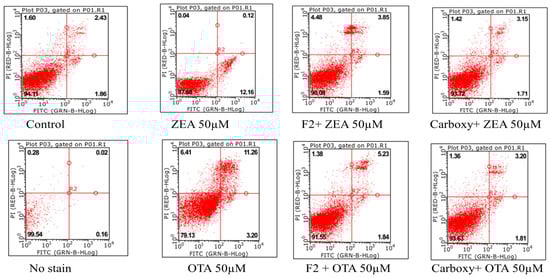 Determination of in vitro cell apoptosis was achieved by Annexin V-FITC and propidium iodide [] staining apoptosis detection commercial kit (BD Pharmingen™ Co. Ltd., San Diego, CA, USA), according to the producer’s guidelines. The cells were cultured into a 6 well plate at a concentration of 3.0 × 105 cells per well and incubated for 24 h. Following the incubation, the culture medium was replaced with new medium having 50-μM ZEA, 50-μM OTA, and ZEA/OTA final products for another 24 h, where buffer (final concentration 0.1%) as the negative control acted as the well media. After 24 h, the cells were washed twice in ice-cold Phosphate Buffered Saline and harvested, then suspended in Annexin V-FITC binding buffer, stained with fluorescent isothiocyanate (FITC)-labeled Annexin V and PI at 37 °C for 15 min in the absence of light, and then measured by flow cytometry (Guava, easy cyte 12HT, 96-well plate reader) through observing 20,000 cells for each experimental result identification.