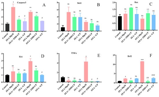 The mRNA expression level of apoptosis gene by ZEA (50 µM), OTA (50 µM) and their enzymatic degradation final products. (A) Caspase3, (B) Sirt1, (C) Bax, (D) IL6, (E) TNFα, (F) Bcl2 mRNA expression level in the Lx2 cells. Cells were exposed to ZEA/OTA and enzymatic degradation derivatives for 24 h. The results are expressed relative to the expression of β-Actin; each set of data shows the mean ± SD of the three independent experiments. *, **, *** indicates a significant difference between ZEA, OTA and control at p < 0.05, p < 0.01, and p < 0.001. ns: not significant. #, ##, ###, indicates a significance difference between ZEA/OTA compare with their enzymatic final products at p < 0.05, p < 0.01, and p < 0.001.