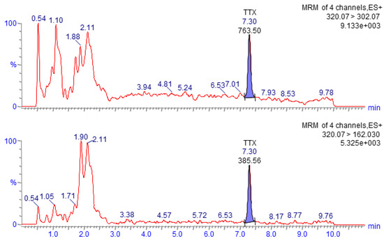 - EURLMB. TTX SOP. Determination of Tetrodotoxin by HILIC-MS/MS; European Union Reference Laboratory for Marine Biotoxins: Vigo, Spain, 2017; Available online: http://www.eurlmb.org (accessed on 18 April 2018).