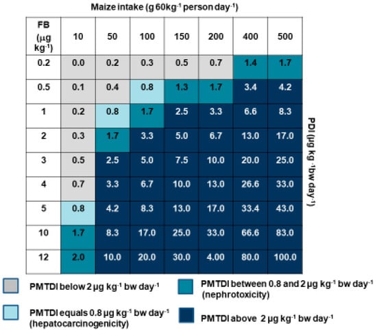 Interactive model illustrating the association between fumonisin B (FB) contamination levels (vertical column) and maize intakes (horizontal column) (adapted from Marasas et al. []).