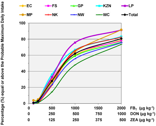 The first model of this kind was developed by Gelderblom et al. [] and revised by Gelderblom and Marasas [] (Figure 1). This model links arbitrary FB levels ranging from 0.2 to 12 µg kg−1, with maize intakes, 10 to 500 g day−1, using a general body weight of 60 kg. Different PDIs were calculated and colour-coded according to four FB risk assessment categories, i.e., PMTDI below or above 2 µg kg−1 bw day−1; PMTDI associated with nephrotoxicity (0.8 µg kg−1 bw day−1); and PMTDI associated with hepatocarcinogenicity (between 0.8 and 2 µg kg−1 bw day−1). This enabled the simulation of risk according to different maize intake patterns related to low- and high-income countries, as well as FB levels relevant to different sources of maize, i.e., home-grown, commercial or imported. However useful this model may be, it does not represent real-time maize intakes or body weight data. A study conducted in collaboration with a prominent South African grain-based manufacturing company, in the form of a national cross-sectional study, provided a unique opportunity to collect relevant sociodemographic information, maize dietary intakes and body weights of commercial maize consumers across South Africa []. Using this data and building on the previous model, the Mycotoxin Risk Assessment Model (MYCORAM) was developed for three relevant mycotoxins FB, DON and ZEA. Arbitrary levels of the three mycotoxins were plotted against specific maize intake categories (g kg−1 body weight day−1) and estimates the percentage of maize consumers exposed above the PMTDI for each mycotoxin (Figure 2). With the additional sociodemographic data that was available [], this model was stratified by provincial region (n = 9). The purpose of this model was to calculate maximum levels to protect South African maize consumers. Using total FB, DON and ZEA levels in two commercial maize milling products (SUPER and SPECIAL maize meal) with overall lower levels compared to home-grown maize, the percentage of people exposed above the respective PMTDI, was dependent on the individual maize intake levels, body weight and subgroups variability related to the sampling strategy. Therefore, subgroups, such as men, known to consume more than women, and their risk may be masked within the MYCORAM. Stratifying risk according to the nine South African Provinces showed between 0.1 to 3% of the consumers residing in MP, LP, Gauteng and Kwa-Zulu Natal were above the limit for the three mycotoxins. Determining the relevant PDIs obtained using the same data, exposure ranged between 4 to 87 ng kg−1 bw day−1 which suggest that there is no risk. However, the MYCORAM is sensitive enough to identify those who are at risk and is therefore effective in predicting ML levels. Interesting when using FB levels relevant to home-grown maize, the percentage of consumers above the PMTDI ranged between 2 and 78% stratified by Province. Although the MYCORAM is unique and sensitive, it is only based on the intake patterns of commercial maize consumers and will require regular and expensive national surveys to remain relevant. In contrast, rural maize subsistence consumers remain the most vulnerable group in South Africa, and with the challenges of epidemiological surveys and food analyses a more valid, affordable and accessible approach is warranted, such as the application of biomarkers of exposure.