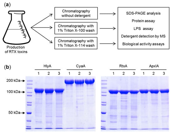 Purification of the repeat in toxin (RTX) toxins. (a) Schematic representation of the purification protocol. RTX toxin-producing E. coli cells were harvested, resuspended in buffer and divided in three equal aliquots that were processed in parallel, with, or without the indicated 1% detergent in the column wash buffer. (b) The indicated RTX toxin samples were separated by 7.5% SDS-PAGE and visualized by Coomassie blue staining. 1—purification without a detergent wash; 2—purification including a 1% Triton X-100 wash; 3—purification including a 1% Triton X-114 wash.