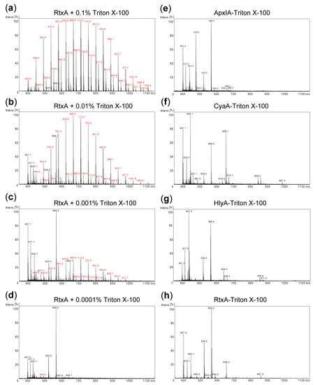 Since traces of the used Triton detergents might potentially interfere with biological activities of the purified RTX toxins and confound cell cytotoxicity assays, it was important to examine whether the detergent was efficiently removed upon excessive column washing with detergent-free 8 M urea buffer. Towards this aim matrix-assisted laser desorption ionization-time-of-flight (MALDI-TOF) mass spectrometry (MS) was employed to detect any residual contamination of the purified RTX toxins by trace amounts of Triton X-100. First, the detergent-free RtxA protein sample (1 mg/mL) was spiked with Triton X-100 in the range of from 0.1 to 0.0001% and analyzed by MALDI-TOF MS. As shown in Figure 2a–d, Triton X-100-specific peaks were unambiguously detected in the MALDI-TOF spectra of RtxA samples containing 0.001% or higher Triton X-100 concentrations. In contrast, no such peaks were present in the spectra of the RTX proteins purified without the use of detergent (Figure S1), or in the spectra obtained for the RTX proteins that were purified using Triton X-100 in the column wash solution (Figure 2e–h). Similar MS results were obtained when Triton X-114 was used to remove endotoxin from the RTX toxin preparations (Figure S2). Hence, if traces of the detergent were still present in the ~10 µM protein preparations, the concentrations of remaining Triton detergent were below the detection limit of the method (~0.001%, or ~16–20 µM). Given that purified toxin stocks are further diluted over 100-fold when assayed for biological activity, protein or LPS content, such low amounts of detergent are well below the effective cytolytic concentration [28] and are very unlikely to interfere in any of these assays.