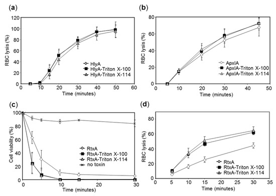 Next, we examined pore-forming (hemolytic) activity of the HlyA and ApxIA hemolysins purified in the presence or absence of Triton X-100 or of Triton X-114. As shown in Figure 4a,b, the hemolytic potency of both RTX hemolysins was not affected at all by the use of Triton X-100 or Triton X-114 detergents in column wash during toxin purification and removal of LPS from toxin preparations had no effect on their cytolytic capacities.