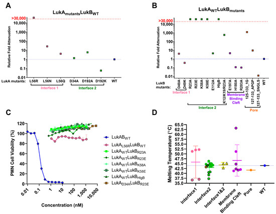 Characterization of LukAB mutants. Polymononuclear neutrophils (PMNs) were treated with increasing concentrations of LukABWT or mutants within the concentration range of 1000 to 0.001 nM to calculate toxicity EC50s. Results represent the fold attenuation (mutant EC50/WT EC50) and shown in (A) for mutants of LukA combined with wild type (WT) LukB and in (B) for mutants of LukB combined with WT LukA mean. Calculated EC50 values are listed in Table 1 and were measured in 3 independent experiments. (C) Toxicity profiles of LukABWT or the most highly attenuated mutant proteins at the indicated concentration range were tested in PMNs as % cell viability. (D) Thermostability measurements using differential scanning fluorimetry (DSF) to calculate melting temperatures (Tms) are plotted for the different, individual LukAB mutants within the different domains. Average values and spread of recorded Tms indicated for each domain. For Interface 1, outlined circles indicate non-LukAL61 mutants. For interface 2, mutants LukAD39ALukBR23E and LukAwtLukBHlgB have been shown as outlined circles in brown and dark green, respectively.
