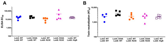 Immunogenicity titers for LukAB mutants. (A) Enzyme-Linked Immunosorbent Assay (ELISA) and (B) toxin neutralization assays (TNA) titers calculated for select mutants with titers for each individual mouse per group and average titers represented by the appropriate symbol and horizontal line, respectively. The Y axis is shown in log scale.