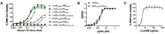 Functional characterization of selected LukAB mutants in PMNs. (A) LukABWT and mutant competition binding to PMNs. (B) ELISA and (C) TNA results testing the quality of binding and neutralization of αLukAB polyclonal antibodies to LukABWT and LukAD39ALukBR23E. All the error bars represent measurements made in duplicates.