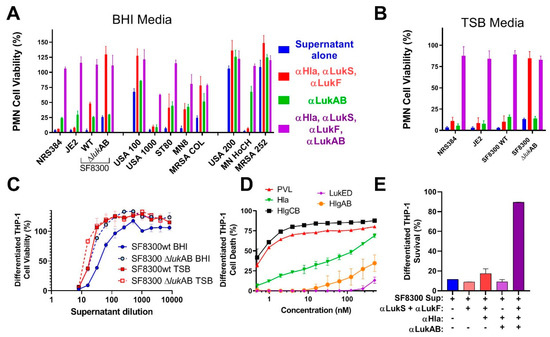Toxicity and TNA of bacterial culture supernatants. Bacterial culture supernatants grown in (A) BHI or (B) TSB media incubated with indicated polyclonal antibodies to measure relative cytotoxicity and neutralization post a 3 h incubation in PMN cells. Error bars indicate measurements made in triplicates. (C) Toxicity profiles of SF8300 wild-type and LukAB-deficient isogenic mutant grown in BHI or TSB media on differentiated THP-1 cells measured 4 h post incubation. Error bars represent measurements made in triplicates. (D) Measurement of toxicity of purified toxoids such as α-toxin and BCPFTs on differentiated THP-1 cells. CTG readout was carried out 1 h post incubation with toxoids and error bars indicate measurements made in duplicates. (E) TNA results of supernatants from SF8300WT or SF8300ΔlukAB strains grown in TSB and BHI media and incubated with αLukAB, αLukS, αLukF, or αHla, or a combination as labeled for 4 h to measure extent of neutralization indicated by cell viability measurements. Error bars represent measurements made in duplicates.